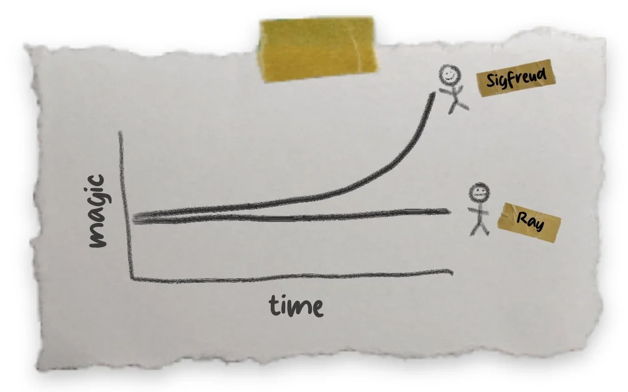 Consider two fictional magicians—Sigfreud and Ray. Both have dreams of performing a magic show in Las Vegas, but their small, daily habits will set them on different paths. Sigfreud adopts a simple habit—spending just 30 minutes every morning in dedicated rehearsal, research, and/or planning to improve his show. Ray makes no change. He continues to practice occasionally, when he has a show coming up or when he’s feeling inspired, but he hasn’t dedicated any specific time to his sparkly, neon goal. Rather, he spends his half hour every morning scrolling through TikTok or Facebook (or worse, catty magic forums). In a few weeks, both wannabe-stars are in more or less the same places they started. In 3 months, a whole lot hasn’t changed; maybe Sigfreud’s show is starting to become a little more polished (after all, he has already dedicated 45 hours to it). Give it time, and one year later, Sigfreud will be a hell of a lot closer to a Vegas stage than Ray, who, despite starting with the same goal, lacked the consistency required for the Compound Effect to work its magic. Within a few years, if they stay on these paths, Ray just may be buying a ticket to Sigfreud’s show at The Mirooje.